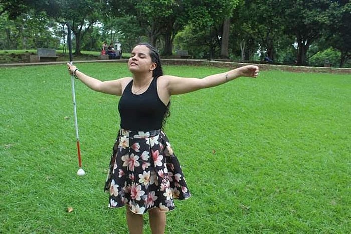 A picture of Estefanía Cubillos Nova with her arms open. She’s holding a white cane in her right hand. Credit: Gabriel Elliot.